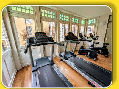 Sportlich Aktive haben im Dünenschloss außerdem die Möglichkeit, im großzügigen, gut ausgestatteten Fitnessraum (u.a. Crosstrainer, Ergometer, Laufband) zu trainieren. Die Nutzung ist für unsere Gäste kostenfrei!